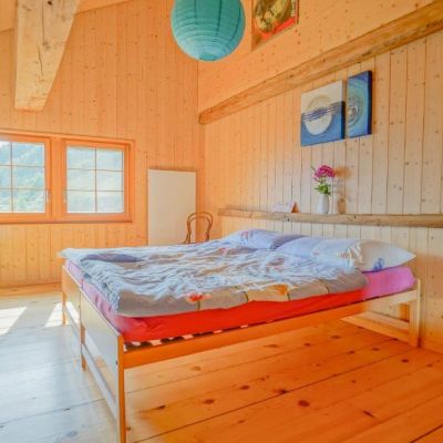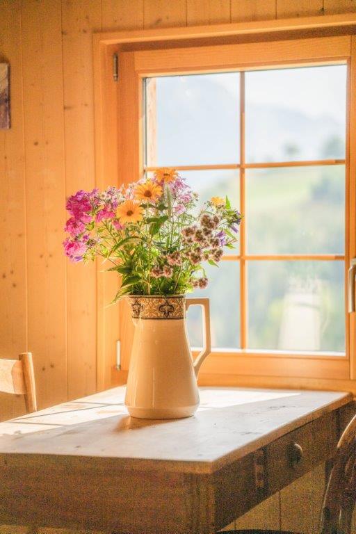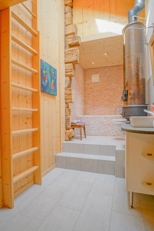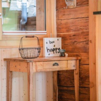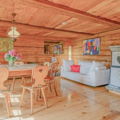 Das Haus stammt aus 1808 und wurde 2011 und 2019 von der Familie der Urenkelin liebevoll umgebaut. Sie achteten darauf, so viel wie möglich an Originalem zu erhalten: Die historische Fassade, das typische Lärchenholz, die Struktur (Balken), das Wohnzimmer mit dem Giltsteinofen, den Keller, der Stall oder das «Salti».
